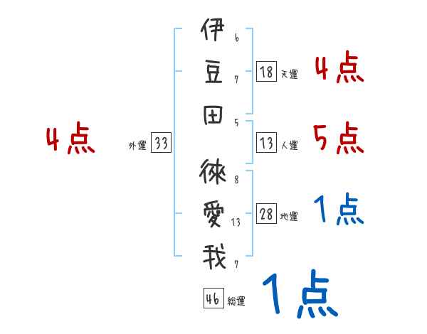 天運![]() | 伊豆田徠愛我さんの天運は18画の4つ星!情熱的で剛気。忍耐力があり信頼される。 家系が持つ宿命的な運勢を表します。祖先から受け継いだ苗字ですので自分の力が及びません。家柄を象徴します。 |