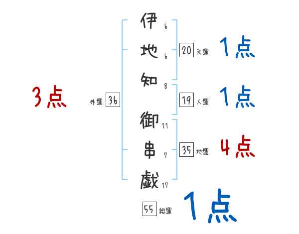 人運![]() | 伊地知御串戯さんの人運は19画の1つ星!優れた才能を持ちますが、協調性が足りないことも。周りの人と協力する事を意識しましょう。 性格や才能などを表す2番目に重要な運勢です。人間関係や協調性、社会的な成功に影響します。主に20歳から50歳ぐらいまでの中年期の運勢を表します。 |