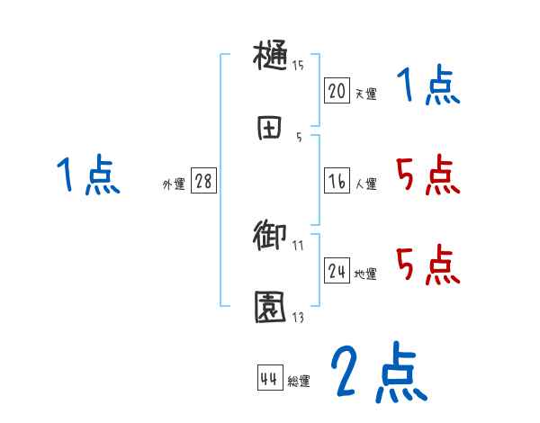 人運![]() | 樋田御園さんの人運は16画の5つ星!人望が厚く大きく発展する。逆転成功が見える。 性格や才能などを表す2番目に重要な運勢です。人間関係や協調性、社会的な成功に影響します。主に20歳から50歳ぐらいまでの中年期の運勢を表します。 |