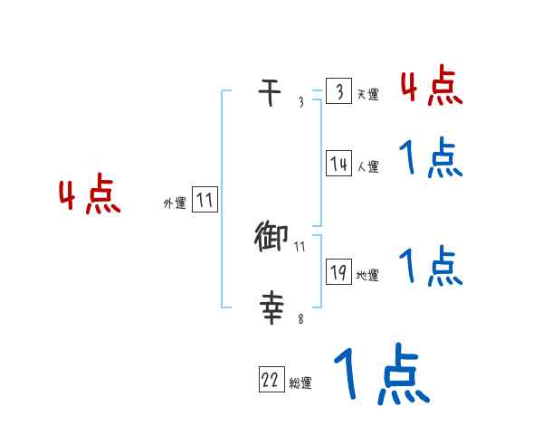 天運![]() | 千御幸さんの天運は3画の4つ星!活動的で才能に恵まれ、多くの信頼を得る。希望に満ち成長する。 家系が持つ宿命的な運勢を表します。祖先から受け継いだ苗字ですので自分の力が及びません。家柄を象徴します。 |