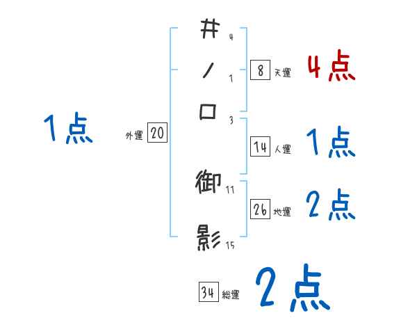 総運![]() | 井ノ口御影さんの総運は34画の2つ星!独創性に優れるが、自尊心が強く災難に注意しましょう。 あなたの人生を表す1番重要な運勢です。生涯を通じて影響する総合運となり、主に50歳以降の晩年期に影響を及ぼします。 |