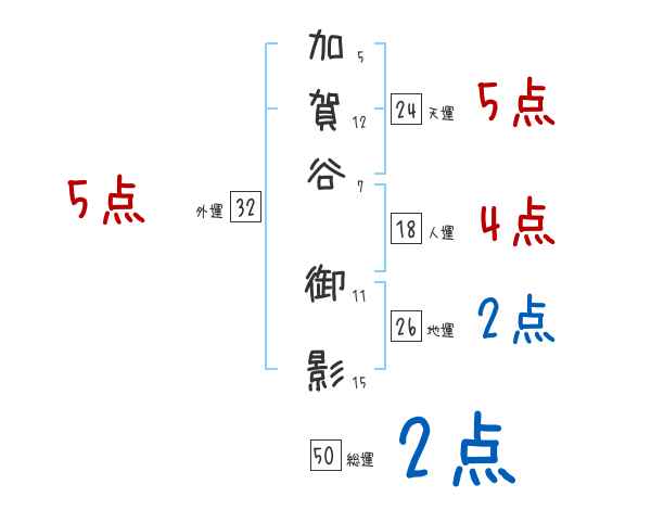 外運![]() | 加賀谷御影さんの外運は32画の5つ星!柔軟性があり成功する。チャンスが多く金運が良い。 生活面を象徴する運勢です。外部から受ける影響力を表し、結婚運、家庭運や職場、環境への順応性を表します。 |