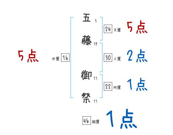天運![]() | 五藤御祭さんの天運は24画の5つ星!家庭運が良く順調な人生。金運にも恵まれる。 家系が持つ宿命的な運勢を表します。祖先から受け継いだ苗字ですので自分の力が及びません。家柄を象徴します。 |