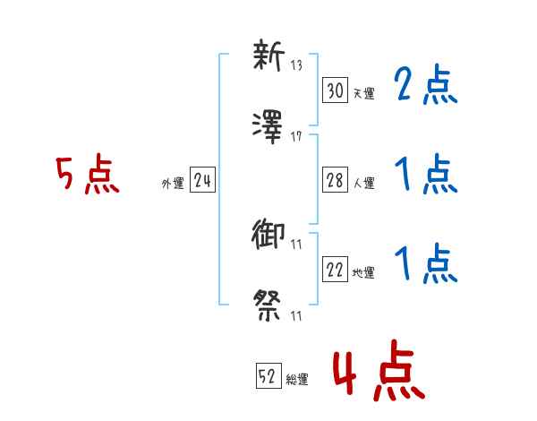 天運![]() | 新澤御祭さんの天運は30画の2つ星!浮き沈みの激しさに注意しましょう。 家系が持つ宿命的な運勢を表します。祖先から受け継いだ苗字ですので自分の力が及びません。家柄を象徴します。 |