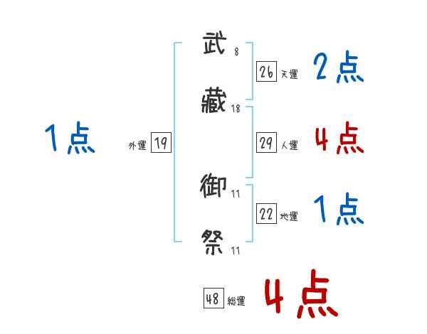 人運![]() | 武藏御祭さんの人運は29画の4つ星!完全主義で才能がある。厳格な心の持ち主。 性格や才能などを表す2番目に重要な運勢です。人間関係や協調性、社会的な成功に影響します。主に20歳から50歳ぐらいまでの中年期の運勢を表します。 |