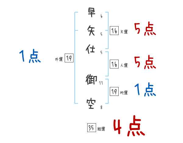 天運![]() | 早矢仕御空さんの天運は16画の5つ星!人望が厚く大きく発展する。逆転成功が見える。 家系が持つ宿命的な運勢を表します。祖先から受け継いだ苗字ですので自分の力が及びません。家柄を象徴します。 |