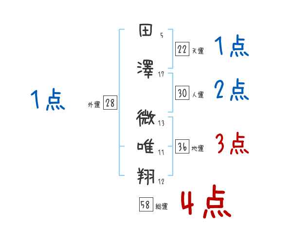 天運![]() | 田澤微唯翔さんの天運は22画の1つ星!努力することが苦手ないっぽう手先が器用。芸術性にも優れる。 家系が持つ宿命的な運勢を表します。祖先から受け継いだ苗字ですので自分の力が及びません。家柄を象徴します。 |