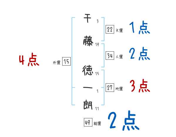 外運![]() | 千藤徳一朗さんの外運は15画の4つ星!人徳があり出世する。順調に物事を進め円満な人生。 生活面を象徴する運勢です。外部から受ける影響力を表し、結婚運、家庭運や職場、環境への順応性を表します。 |