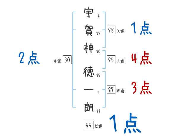 | 天運  | 宇賀神徳一朗さんの天運は28画の1つ星!家庭環境に注意。スポーツで活躍できる能力があるかも。家系が持つ宿命的な運勢を表します。祖先から受け継いだ苗字ですので自分の力が及びません。家柄を象徴します。 |