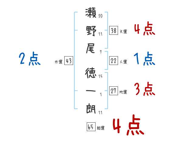 総運![]() | 瀬野尾徳一朗さんの総運は65画の4つ星!幸運に恵まれ繁栄する。包容力がある。 あなたの人生を表す1番重要な運勢です。生涯を通じて影響する総合運となり、主に50歳以降の晩年期に影響を及ぼします。 |
