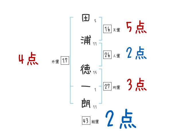 天運![]() | 田浦徳一朗さんの天運は16画の5つ星!人望が厚く大きく発展する。逆転成功が見える。 家系が持つ宿命的な運勢を表します。祖先から受け継いだ苗字ですので自分の力が及びません。家柄を象徴します。 |