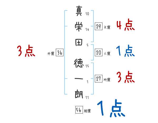 天運![]() | 真栄田徳一朗さんの天運は29画の4つ星!完全主義で才能がある。厳格な心の持ち主。 家系が持つ宿命的な運勢を表します。祖先から受け継いだ苗字ですので自分の力が及びません。家柄を象徴します。 |