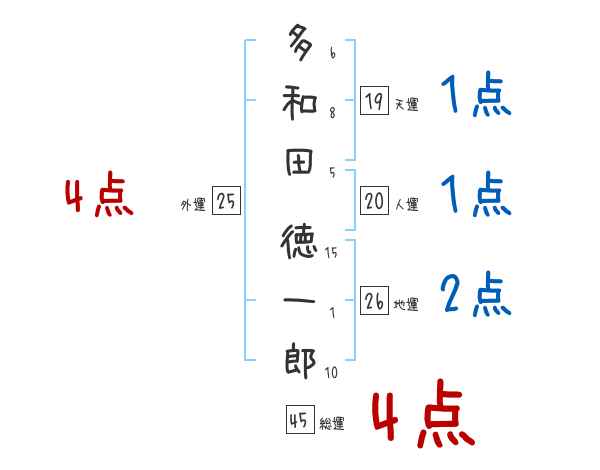 総運![]() | 多和田徳一郎さんの総運は45画の4つ星!もくもくと物事を進め達成する。地味な努力家。 あなたの人生を表す1番重要な運勢です。生涯を通じて影響する総合運となり、主に50歳以降の晩年期に影響を及ぼします。 |