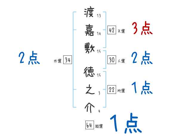外運![]() | 渡嘉敷徳之介さんの外運は34画の2つ星!独創性に優れるが、自尊心が強く災難に注意しましょう。 生活面を象徴する運勢です。外部から受ける影響力を表し、結婚運、家庭運や職場、環境への順応性を表します。 |