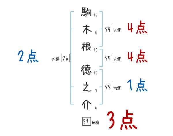 総運![]() | 駒木根徳之介さんの総運は51画の3つ星!変化が激しく、危険に注意。堅実な性格。 あなたの人生を表す1番重要な運勢です。生涯を通じて影響する総合運となり、主に50歳以降の晩年期に影響を及ぼします。 |