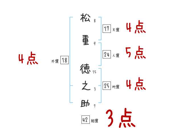 天運![]() | 松重徳之助さんの天運は17画の4つ星!積極的な行動力。地位を気づき財産を手に入れる。純粋な心と直感力。 家系が持つ宿命的な運勢を表します。祖先から受け継いだ苗字ですので自分の力が及びません。家柄を象徴します。 |