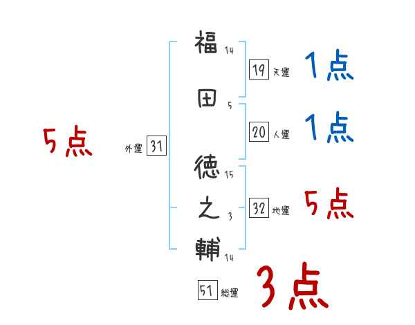 総運![]() | 福田徳之輔さんの総運は51画の3つ星!変化が激しく、危険に注意。堅実な性格。 あなたの人生を表す1番重要な運勢です。生涯を通じて影響する総合運となり、主に50歳以降の晩年期に影響を及ぼします。 |