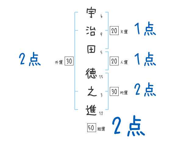 総運![]() | 宇治田徳之進さんの総運は50画の2つ星!浮き沈みが激しく不安定。しりすぼみに衰退しやすいので注意しましょう。 あなたの人生を表す1番重要な運勢です。生涯を通じて影響する総合運となり、主に50歳以降の晩年期に影響を及ぼします。 |