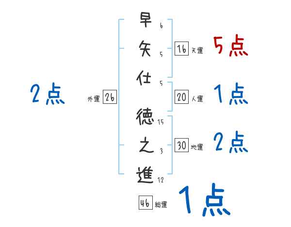 天運![]() | 早矢仕徳之進さんの天運は16画の5つ星!人望が厚く大きく発展する。逆転成功が見える。 家系が持つ宿命的な運勢を表します。祖先から受け継いだ苗字ですので自分の力が及びません。家柄を象徴します。 |