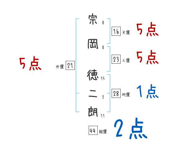 天運![]() | 宗岡徳二朗さんの天運は16画の5つ星!人望が厚く大きく発展する。逆転成功が見える。 家系が持つ宿命的な運勢を表します。祖先から受け継いだ苗字ですので自分の力が及びません。家柄を象徴します。 |