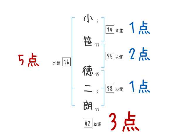 天運![]() | 小笹徳二朗さんの天運は14画の1つ星!人に対して優しいがストレスを溜め込みがち。人間関係のトラブルを避けるよう気をつけましょう。 家系が持つ宿命的な運勢を表します。祖先から受け継いだ苗字ですので自分の力が及びません。家柄を象徴します。 |