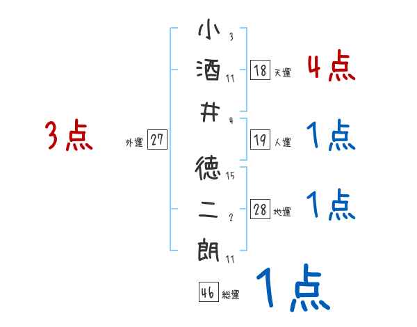 天運![]() | 小酒井徳二朗さんの天運は18画の4つ星!情熱的で剛気。忍耐力があり信頼される。 家系が持つ宿命的な運勢を表します。祖先から受け継いだ苗字ですので自分の力が及びません。家柄を象徴します。 |