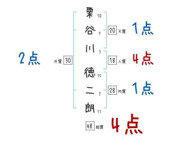 総運![]() | 栗谷川徳二朗さんの総運は48画の4つ星!賢明な性格で人望が厚い。指導力があり多くの人に尊敬される。 あなたの人生を表す1番重要な運勢です。生涯を通じて影響する総合運となり、主に50歳以降の晩年期に影響を及ぼします。 |