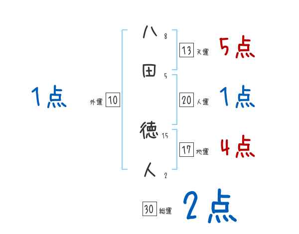 天運![]() | 八田徳人さんの天運は13画の5つ星!才能に恵まれ人気がある。名声を手に入れる。円満な人生。 家系が持つ宿命的な運勢を表します。祖先から受け継いだ苗字ですので自分の力が及びません。家柄を象徴します。 |