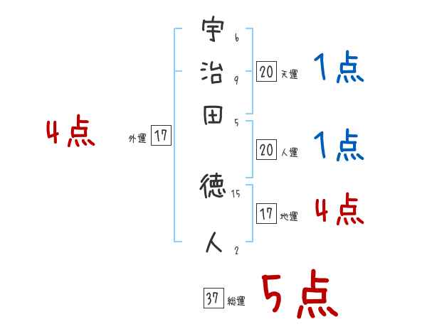 外運![]() | 宇治田徳人さんの外運は17画の4つ星!積極的な行動力。地位を気づき財産を手に入れる。純粋な心と直感力。 生活面を象徴する運勢です。外部から受ける影響力を表し、結婚運、家庭運や職場、環境への順応性を表します。 |