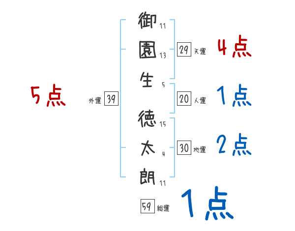 外運![]() | 御園生徳太朗さんの外運は39画の5つ星!社交性に優れ人望が厚い。人の上に立ち成功する。 生活面を象徴する運勢です。外部から受ける影響力を表し、結婚運、家庭運や職場、環境への順応性を表します。 |