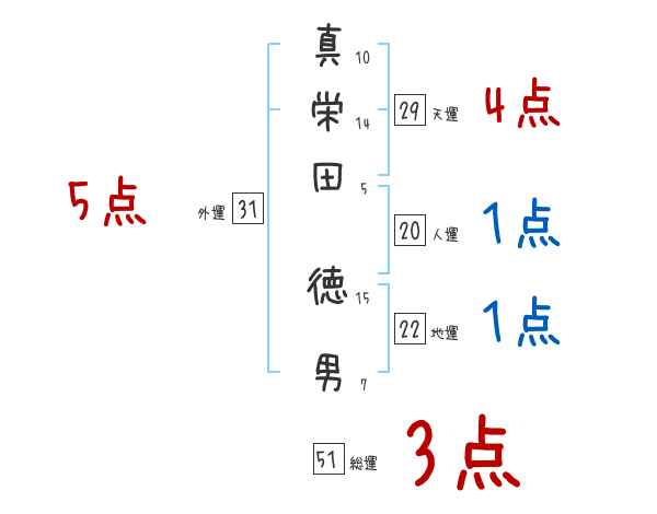 総運![]() | 真栄田徳男さんの総運は51画の3つ星!変化が激しく、危険に注意。堅実な性格。 あなたの人生を表す1番重要な運勢です。生涯を通じて影響する総合運となり、主に50歳以降の晩年期に影響を及ぼします。 |
