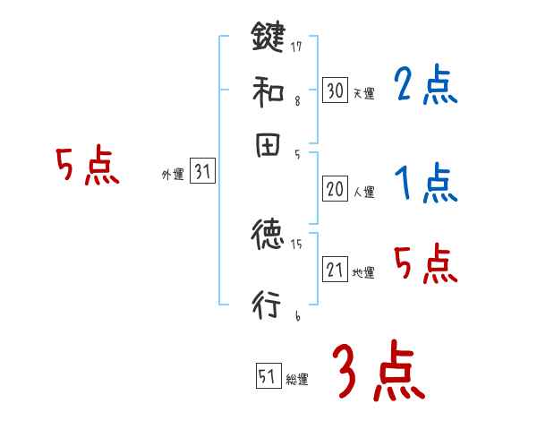 天運![]() | 鍵和田徳行さんの天運は30画の2つ星!浮き沈みの激しさに注意しましょう。 家系が持つ宿命的な運勢を表します。祖先から受け継いだ苗字ですので自分の力が及びません。家柄を象徴します。 |