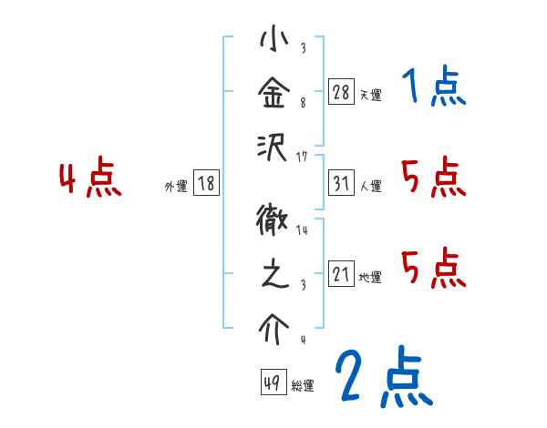 天運![]() | 小金沢徹之介さんの天運は28画の1つ星!家庭環境に注意。スポーツで活躍できる能力があるかも。 家系が持つ宿命的な運勢を表します。祖先から受け継いだ苗字ですので自分の力が及びません。家柄を象徴します。 |