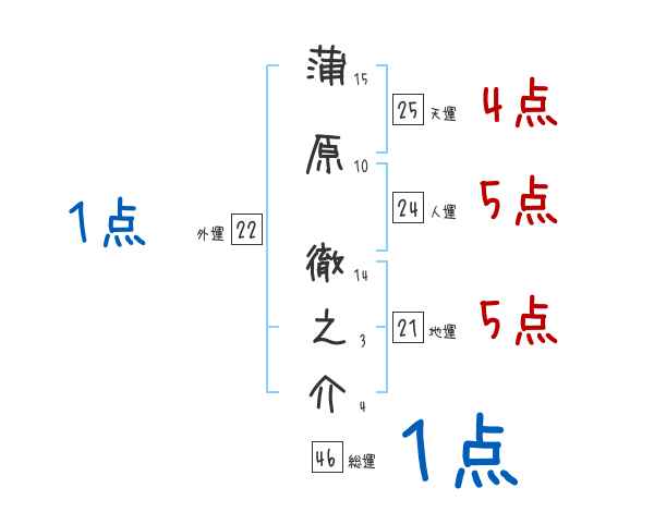 総運![]() | 蒲原徹之介さんの総運は46画の1つ星!迷走することが多く苦労するかも。目先のことにとらわれないように。 あなたの人生を表す1番重要な運勢です。生涯を通じて影響する総合運となり、主に50歳以降の晩年期に影響を及ぼします。 |