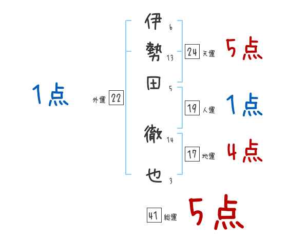天運![]() | 伊勢田徹也さんの天運は24画の5つ星!家庭運が良く順調な人生。金運にも恵まれる。 家系が持つ宿命的な運勢を表します。祖先から受け継いだ苗字ですので自分の力が及びません。家柄を象徴します。 |