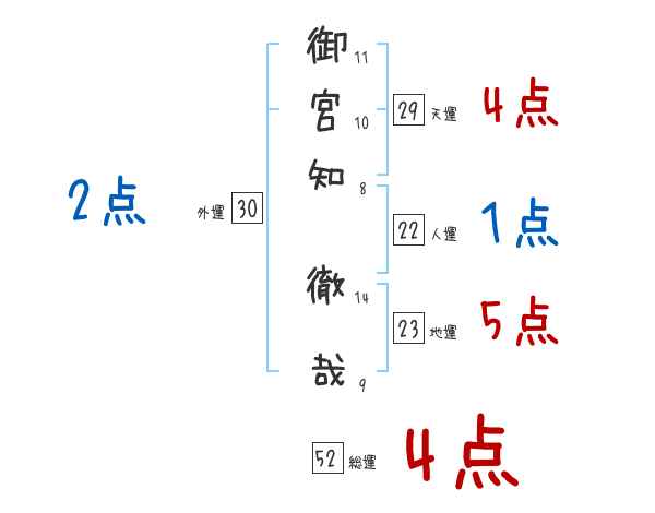 総運![]() | 御宮知徹哉さんの総運は52画の4つ星!先見性と独創性に優れ考える力がある。強運の持ち主。 あなたの人生を表す1番重要な運勢です。生涯を通じて影響する総合運となり、主に50歳以降の晩年期に影響を及ぼします。 |