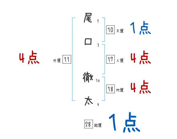 総運![]() | 尾口徹太さんの総運は28画の1つ星!家庭環境に注意。スポーツで活躍できる能力があるかも。 あなたの人生を表す1番重要な運勢です。生涯を通じて影響する総合運となり、主に50歳以降の晩年期に影響を及ぼします。 |