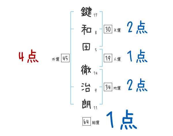 天運![]() | 鍵和田徹治朗さんの天運は30画の2つ星!浮き沈みの激しさに注意しましょう。 家系が持つ宿命的な運勢を表します。祖先から受け継いだ苗字ですので自分の力が及びません。家柄を象徴します。 |
