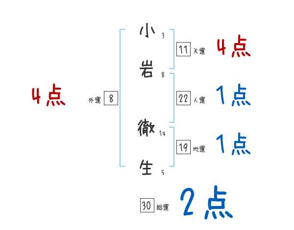 天運![]() | 小岩徹生さんの天運は11画の4つ星!着実に富や地位を得る幸運な人生。 家系が持つ宿命的な運勢を表します。祖先から受け継いだ苗字ですので自分の力が及びません。家柄を象徴します。 |