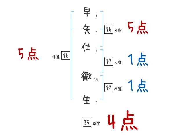 外運![]() | 早矢仕徹生さんの外運は16画の5つ星!人望が厚く大きく発展する。逆転成功が見える。 生活面を象徴する運勢です。外部から受ける影響力を表し、結婚運、家庭運や職場、環境への順応性を表します。 |