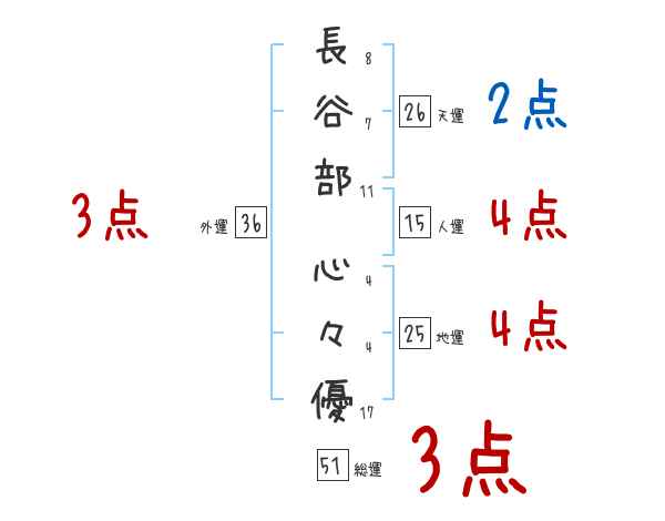 天運![]() | 長谷部心々優さんの天運は26画の2つ星!波瀾万丈かも。信頼できる人を大事にしましょう。 家系が持つ宿命的な運勢を表します。祖先から受け継いだ苗字ですので自分の力が及びません。家柄を象徴します。 |