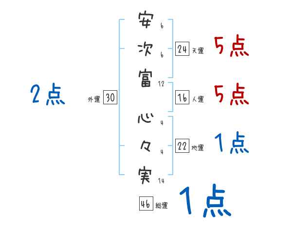 人運![]() | 安次富心々実さんの人運は16画の5つ星!人望が厚く大きく発展する。逆転成功が見える。 性格や才能などを表す2番目に重要な運勢です。人間関係や協調性、社会的な成功に影響します。主に20歳から50歳ぐらいまでの中年期の運勢を表します。 |