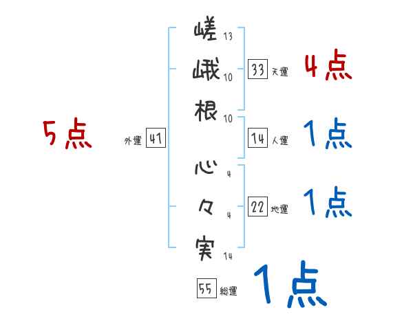 天運![]() | 嵯峨根心々実さんの天運は33画の4つ星!権力志向でプライドが高い。勇気があり運を切り開き成功する。 家系が持つ宿命的な運勢を表します。祖先から受け継いだ苗字ですので自分の力が及びません。家柄を象徴します。 |