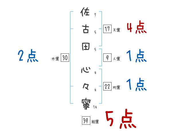 総運![]() | 佐古田心々寧さんの総運は39画の5つ星!社交性に優れ人望が厚い。人の上に立ち成功する。 あなたの人生を表す1番重要な運勢です。生涯を通じて影響する総合運となり、主に50歳以降の晩年期に影響を及ぼします。 |
