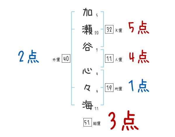 天運![]() | 加瀬谷心々海さんの天運は32画の5つ星!柔軟性があり成功する。チャンスが多く金運が良い。 家系が持つ宿命的な運勢を表します。祖先から受け継いだ苗字ですので自分の力が及びません。家柄を象徴します。 |