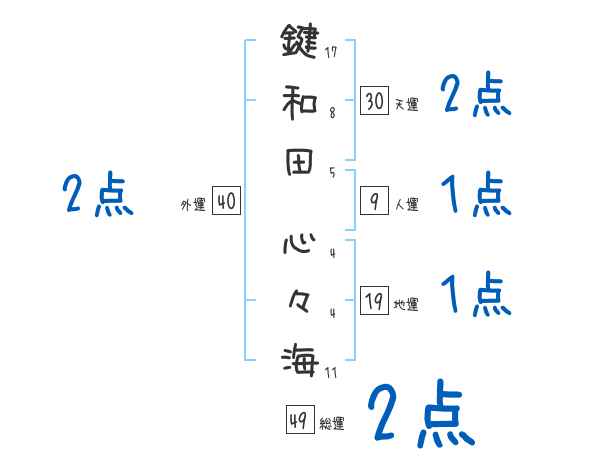 総運![]() | 鍵和田心々海さんの総運は49画の2つ星!不安定な性格で明暗がある人生。周りの人には支援されやすい。 あなたの人生を表す1番重要な運勢です。生涯を通じて影響する総合運となり、主に50歳以降の晩年期に影響を及ぼします。 |