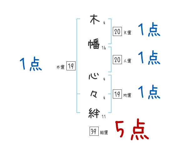 総運![]() | 木幡心々絆さんの総運は39画の5つ星!社交性に優れ人望が厚い。人の上に立ち成功する。 あなたの人生を表す1番重要な運勢です。生涯を通じて影響する総合運となり、主に50歳以降の晩年期に影響を及ぼします。 |