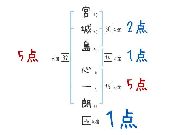 外運![]() | 宮城島心一朗さんの外運は32画の5つ星!柔軟性があり成功する。チャンスが多く金運が良い。 生活面を象徴する運勢です。外部から受ける影響力を表し、結婚運、家庭運や職場、環境への順応性を表します。 |