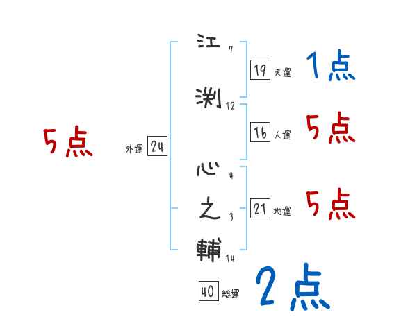 人運![]() | 江渕心之輔さんの人運は16画の5つ星!人望が厚く大きく発展する。逆転成功が見える。 性格や才能などを表す2番目に重要な運勢です。人間関係や協調性、社会的な成功に影響します。主に20歳から50歳ぐらいまでの中年期の運勢を表します。 |
