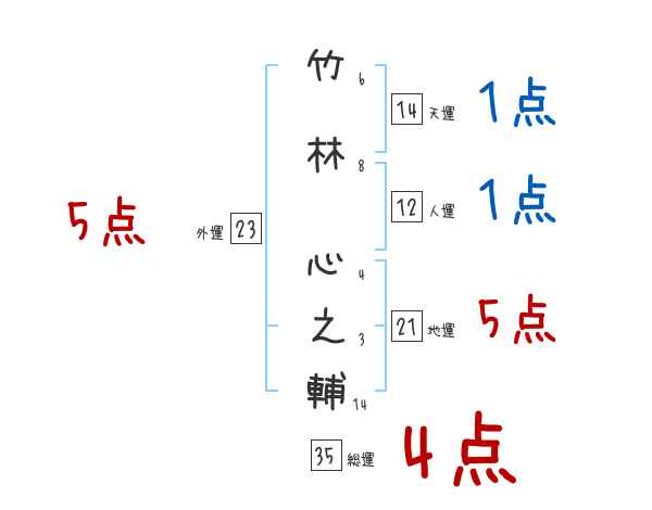 天運![]() | 竹林心之輔さんの天運は14画の1つ星!人に対して優しいがストレスを溜め込みがち。人間関係のトラブルを避けるよう気をつけましょう。 家系が持つ宿命的な運勢を表します。祖先から受け継いだ苗字ですので自分の力が及びません。家柄を象徴します。 |